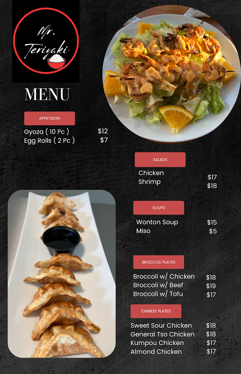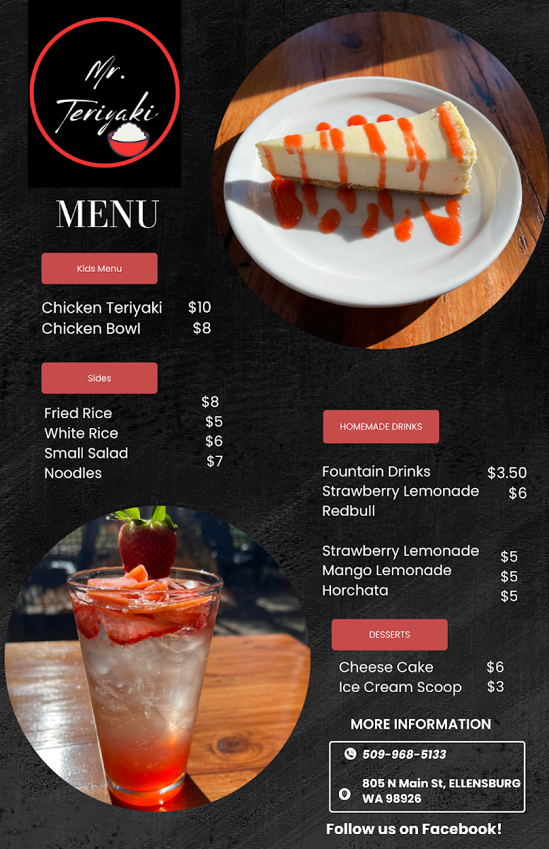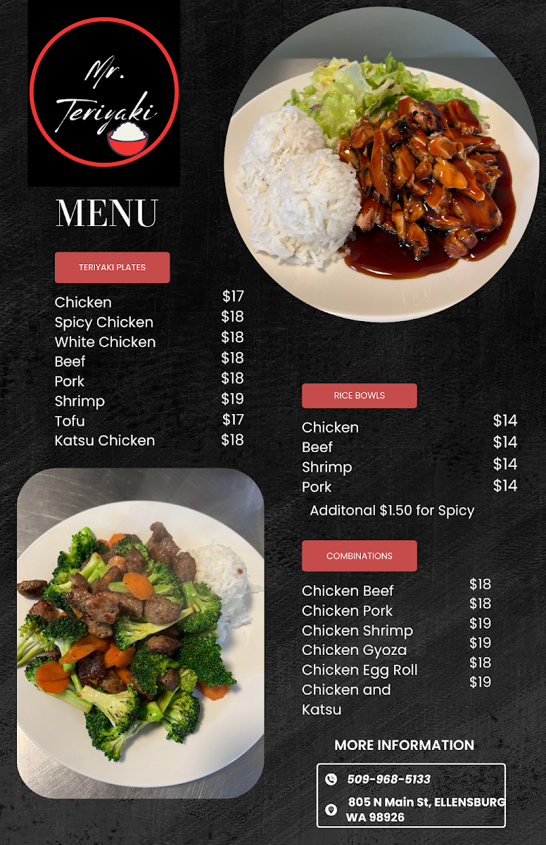 Welcome to Mr. Teriyaki, a delightful eatery located at 805 N Main St, Ellensburg, WA. This restaurant is your go-to destination for authentic Seattle-style teriyaki and offers an inviting atmosphere complemented by its charming cabin-like interior. The menu boasts an array of delicious combinations, including Chicken & Beef and Mongolian Plates, all served with rice and fresh salad. Customers rave about the skillful grilling that imparts a perfect char and the unique poppyseed salad dressing. Don’t miss the tempting appetizers, like Egg Rolls and Gyozas. Diners consistently highlight the generous portion sizes and the freshness of ingredients, making each meal a satisfying experience. Whether you're stopping by for a quick bite or planning a family outing, Mr. Teriyaki promises a culinary adventure that leaves you wanting more. Visit this cozy gem for an unforgettable taste of teriyaki bliss!